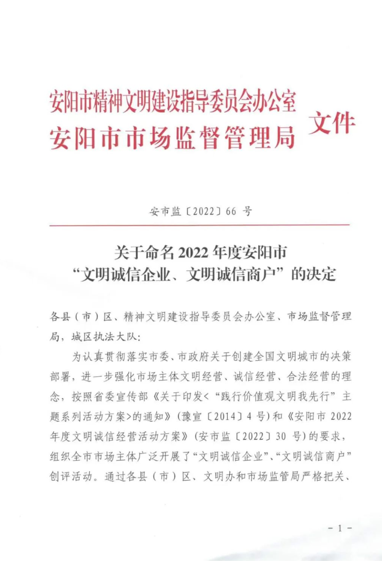 文件指出:為認(rèn)真貫徹落實(shí)市委、市政府關(guān)于創(chuàng)建全國文明城市的決策部署,進(jìn)一步強(qiáng)化市場(chǎng)主體文明經(jīng)營、誠信經(jīng)營、合法經(jīng)營的理念,組織全市市場(chǎng)主體廣泛開展了“文明誠信企業(yè)”、“文明誠信商戶”創(chuàng)評(píng)活動(dòng)。通過各縣(市)、區(qū)文明辦和市場(chǎng)監(jiān)管局嚴(yán)格把關(guān)、逐級(jí)推薦,經(jīng)市文明辦、市市場(chǎng)監(jiān)管局研究,對(duì)在2022年度文明誠信經(jīng)營活動(dòng)中成績突出的河南潤安建設(shè)集團(tuán)有限公司等143家企業(yè)予以命名。具體文件如下: 潤安集團(tuán)長期以來高度重視企業(yè)信用管理,堅(jiān)持誠信經(jīng)營,傾力打造“潤安”品牌。此次獲評(píng)文明誠信企業(yè),充分說明了潤安集團(tuán)在企業(yè)信譽(yù)、品牌建設(shè)方面得到了社會(huì)的高度認(rèn)可,也必將成為公司高質(zhì)量發(fā)展的強(qiáng)大推動(dòng)力。 下步,潤安集團(tuán)將以此次表彰為契機(jī),以習(xí)近平新時(shí)代中國特色社會(huì)主義思想和黨的二十大精神為指引,時(shí)刻保持依法經(jīng)營、誠信納稅的理念,積極發(fā)揮正面典型示范,樹立文明誠信的良好形象,堅(jiān)持誠信立身、誠信創(chuàng)業(yè),為安陽經(jīng)濟(jì)社會(huì)發(fā)展?fàn)I造良好的市場(chǎng)環(huán)境,為創(chuàng)建文明城市助力加油,作出貢獻(xiàn)。